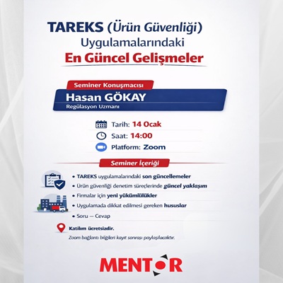 Mentor Akademi olarak 14 Ocak Çarşamba günü saat 14:00 de " TAREKS (ÜRÜN GÜVENLİĞİ) UYGULAMALARINDAKİ EN GÜNCEL GELİŞMELER " konulu seminer gerçekleştiriyor olacağız. Seminer, regülasyon uzmanımız Hasan Gökay tarafından gerçekleştirilecektir.