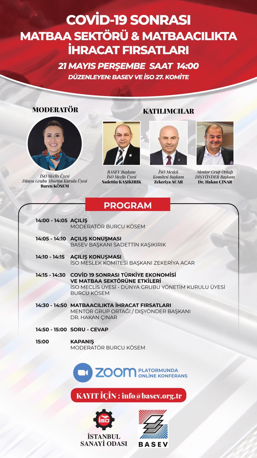 Basev ve İSO 27. Komite tarafından 21.05.2020 tarihinde saat 14:00'de yapılacak moderatörlüğünü İSO Meclis Üyesi ve Dünya Grubu Yönetim Kurulu Üyesi Burcu KÖSEM'in yapacağı "Covid19 Sonrası Matbaa Sektörü & Matbaacılıkta İhracat Fırsatları" konulu panelde , BASEV Başkanı ve İSO Meclis Üyesi Sadettin KAŞIKIRIK ve İSO Meslek Komitesi Başkanı Zekeriya ACAR ile beraber Mentor Grup Ortaklarından Dr. Hakan ÇINAR konuşmacı olarak katılım sağlayacak. Dinlemek isteyen herkesi bekleriz.